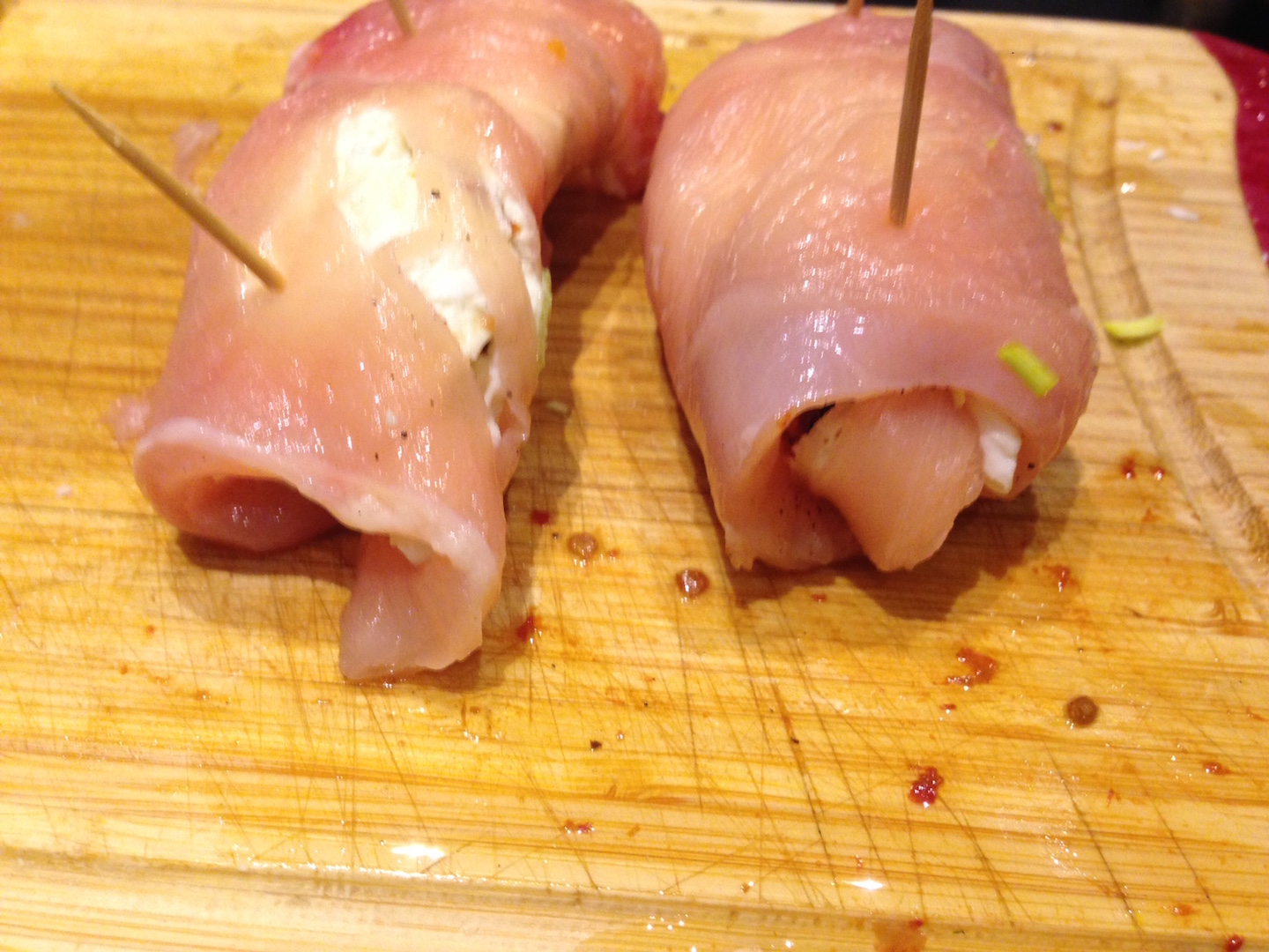 1. Rouler et piquer le tout à l’aide de cure-dents pour tenir les roulés. Faire la même chose pour l’autre escalope.