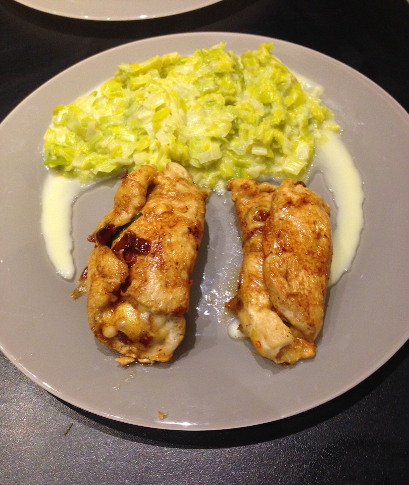 La prochaine fois je mettrai juste un peu plus de mozzarella car on ne la sentait pas suffisamment (mon homme était d’accord) mais c’était vraiment bon accompagné d’une fondue de poireaux.